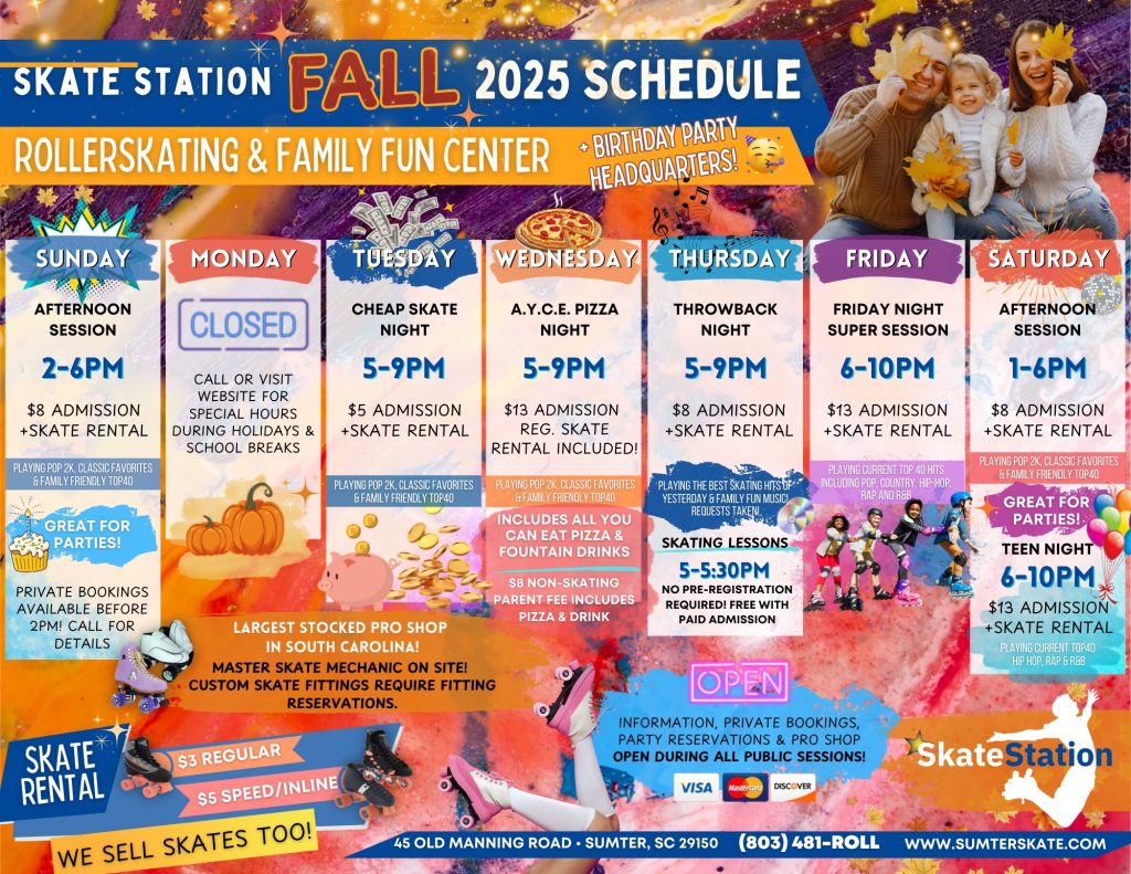 - Complimentary Skate Mate Trainers Included until 5:45PM for beginners as deemed by class instructor.