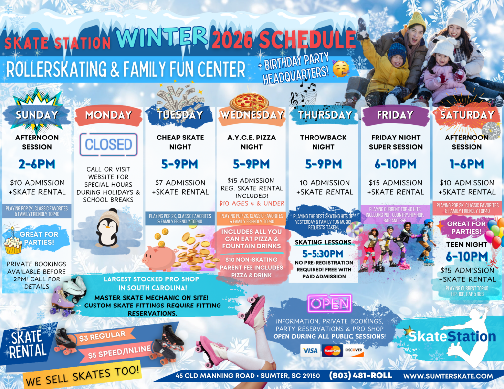 - Free Skating Lessons Included 5:00-5:30PM(Beginner & Intermediate Skills taught in group class).